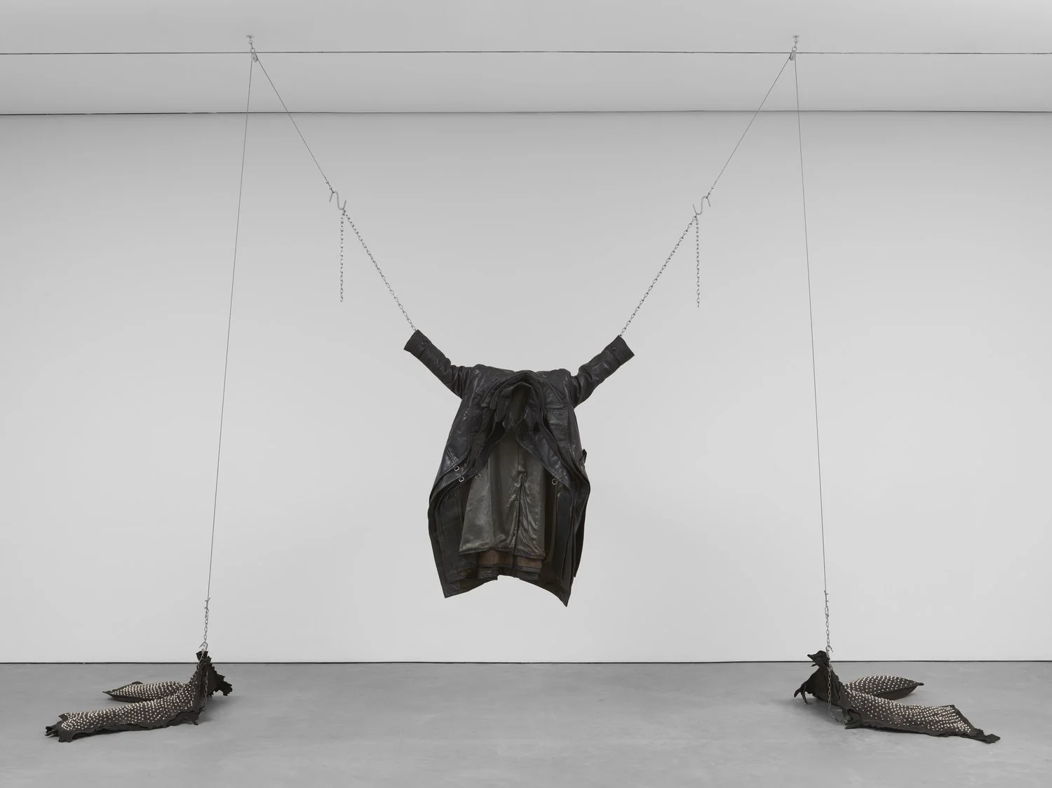 A work titled pupil of couture / 4horsemen hairshirt (SS 2024 apocalypse collection) features four horsehide jackets, similar to those used by soldiers in WWII trenches (hence the name trench coat), nested inside one another, outspread like a crucifix and similarly being held in limbo above the gallery floor by two pairs of studded leather sacks. These resemble stylized saddle bags or chaps used by ranchers or cowboys when herding animals, as well as the kind of spiked jackets worn by punks from the 1970s onwards, long since subsumed into mainstream fashion items. The four jackets also reference the Four Horsemen of the Apocalypse, foretold in The Book of Revelations as harbingers of the End of Days, representing and carrying famine, pestilence, disease and death. The ominous arrival of the four horses was said to precede the Second Coming of Christ, often depicted as an open-armed descent from heaven, although some theologians believe this to be a moment of reckoning, rather than rapture. What, if anything, might be held up for worship here is not entirely clear, but the show’s title, 'A WAY OF LIFE', infers that these objects carry with them evidence of work, leisure and purpose- ways to spend time, and quantify or judge a life.
